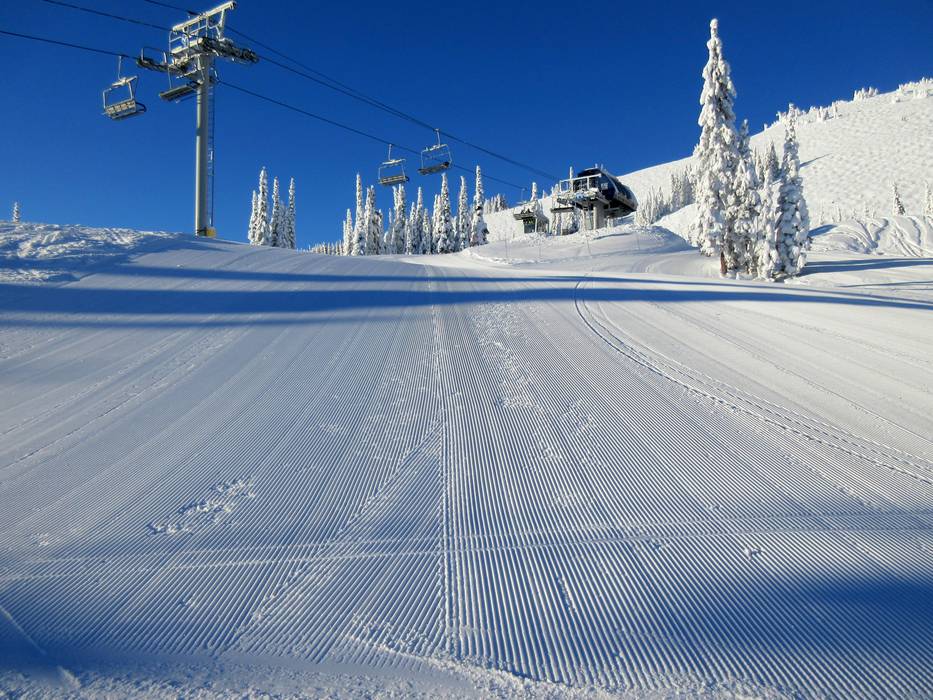 Dans le domaine skiable de Sun Peaks, les pistes sont préparées avec beaucoup d’attention aux détails. Les descentes très raides dans la Crystal Bowl, les descentes en forêt déboisée (gladed runs) et les pistes à bosses ne sont pas préparées.