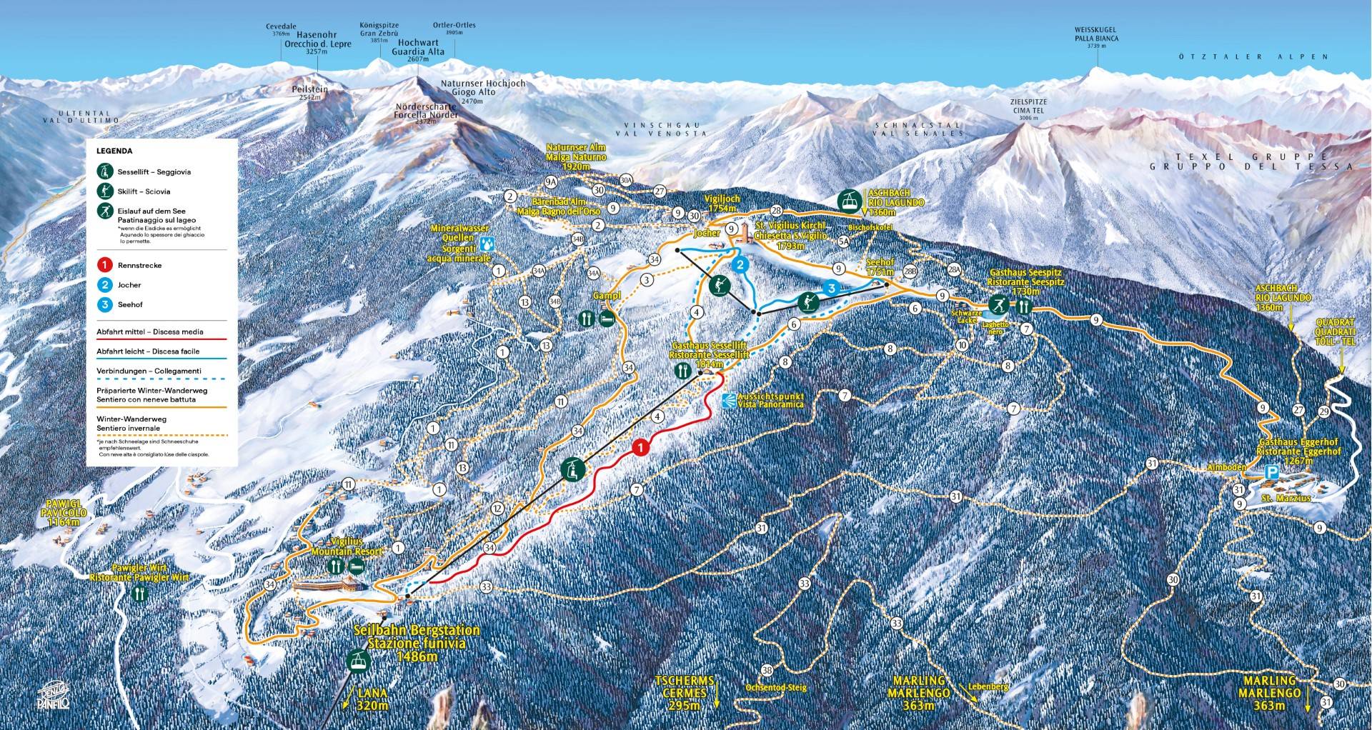 Le plan des pistes présente le Vigiljoch avec toutes les pistes, remontées mécaniques, pistes de luge et sentiers de randonnée. Il n'est parfois pas clair dans quelle direction vont les pistes et les remontées. Les deux téléskis Jocher et Seehof se rejoignent à la station supérieure. Pour les randonneurs, quelques suggestions de randonnées sont indiquées. Au verso, on trouve des informations sur les possibilités de restauration et les horaires.