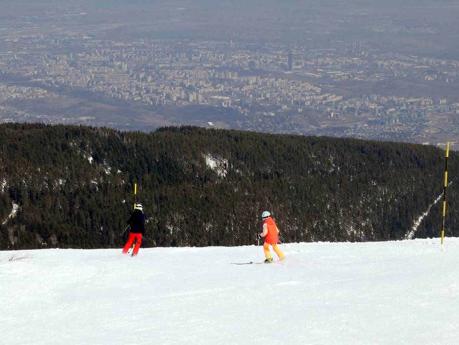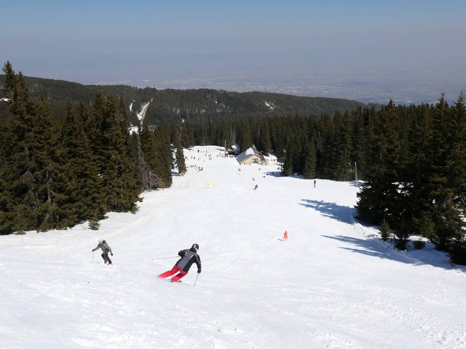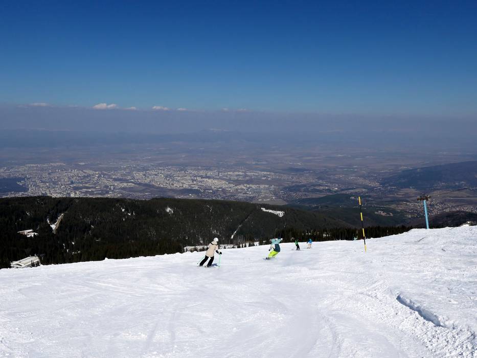 Piste de difficulté moyenne avec vue sur Sofia et plus ancienne piste du domaine skiable
