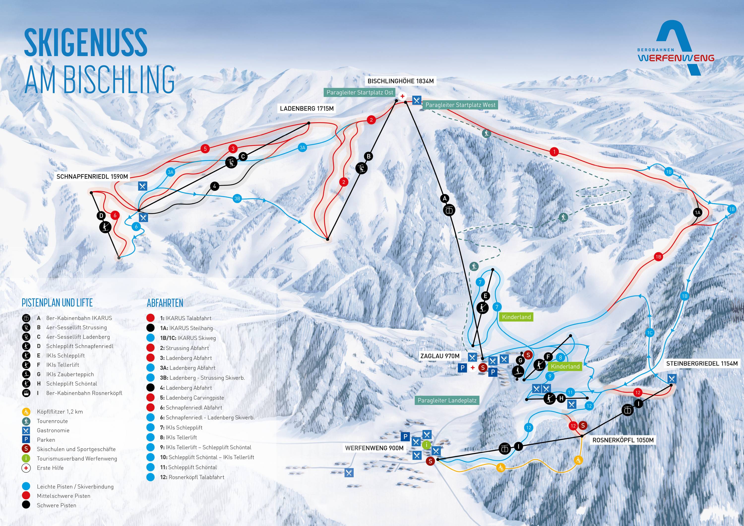 Le plan des pistes de Werfenweng est clair et représente bien le domaine skiable. Les remontées mécaniques et les descentes sont bien indiquées. Des informations complémentaires sont mentionnées. Les altitudes pourraient être ajoutées.