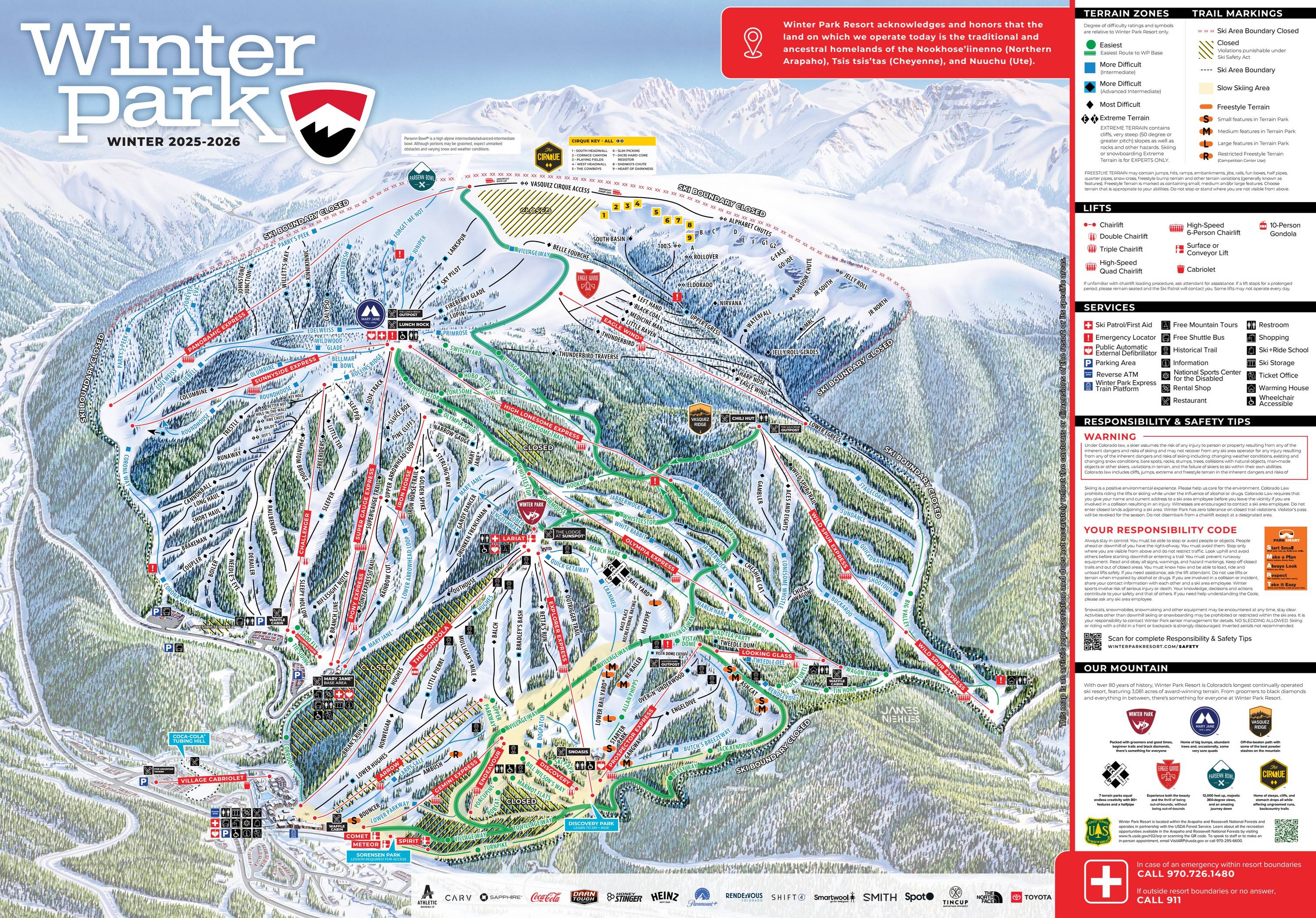 Le plan des pistes représente très bien l'ensemble du Winter Park Resort. Toutes les pistes et remontées mécaniques y sont indiquées. Au verso, vous trouverez des informations sur les restaurants, l'école de ski et de snowboard, les activités en montagne ainsi que d'autres informations importantes.