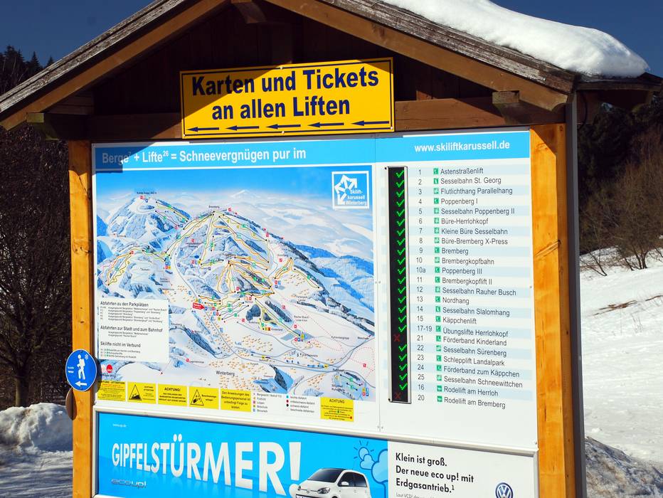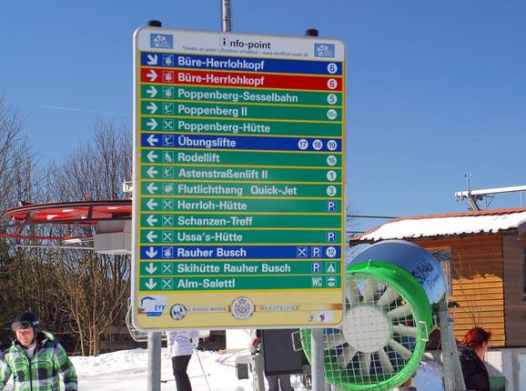 Le Skiliftkarussell de Winterberg est probablement l’un des très rares domaines skiables de moyenne montagne où il arrive que les skieurs ne retrouvent plus le soir le parking où ils ont garé leur voiture. Cependant, la signalisation du domaine skiable a été entièrement renouvelée il y a quelques années et se présente aujourd’hui en très bon état. Aux stations supérieures, des panneaux indiquent la direction des remontées mécaniques, des refuges et des parkings. Cependant, les panneaux panoramiques ne se trouvent qu’à quelques endroits du domaine skiable. Ceux-ci disposent toutefois d’un affichage dynamique de l’état des remontées.