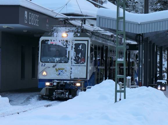 À la gare principale de Garmisch-Partenkirchen, vous pouvez monter directement à bord du Bayerische Zugspitzbahn (chemin de fer à crémaillère). Le trajet jusqu’au domaine skiable sur la Zugspitze dure environ 75 minutes et passe par les gares suivantes : Hausberg, Kreuzeck-/Alpspitzbahn, Hammersbach, Grainau, Eibsee, Riffelriß et Zugspitzplatt. - Navettes