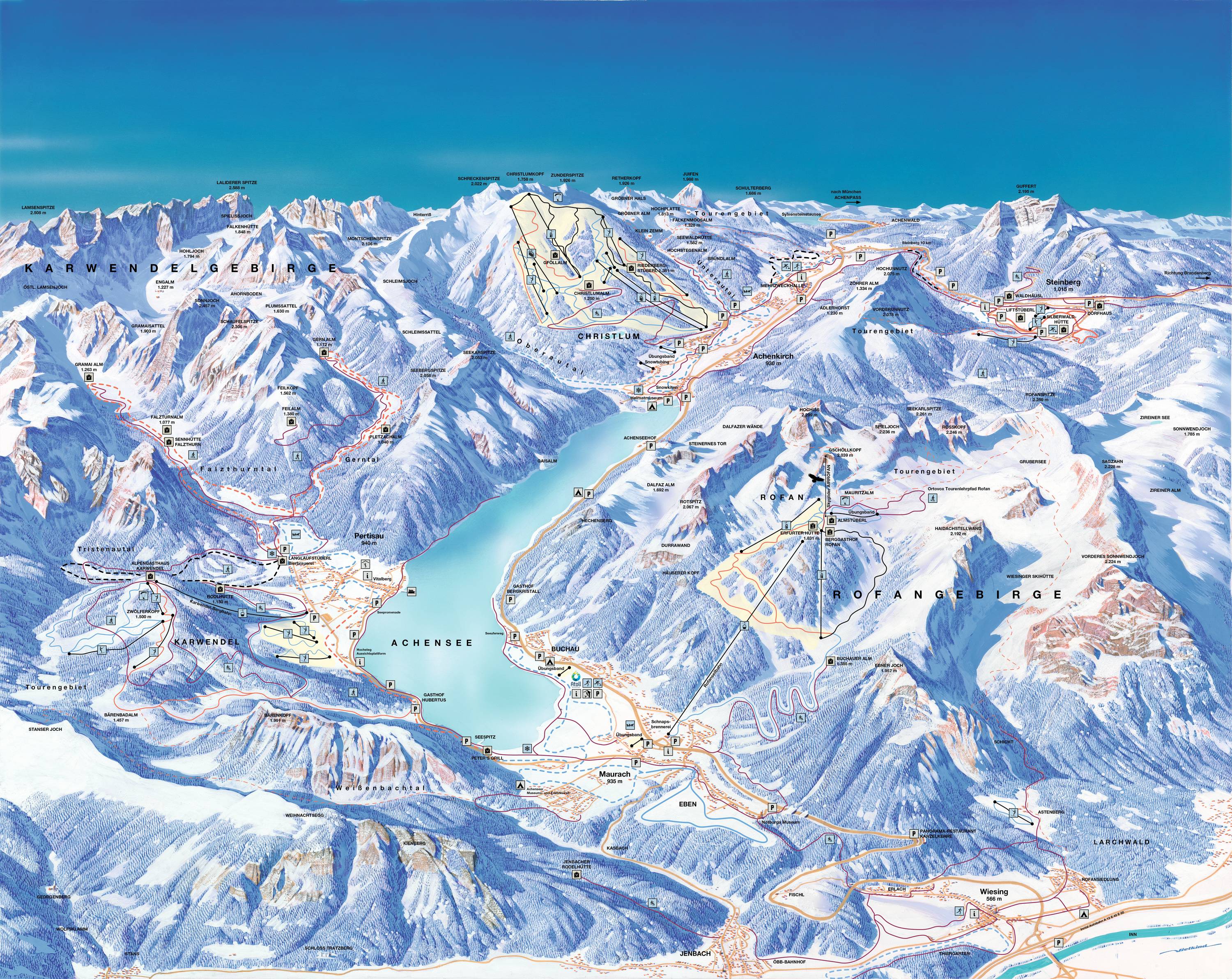 À l' Achensee (lac d'Achen), les 5 domaines skiables suivants offrent un plan des pistes ou une carte panoramique.