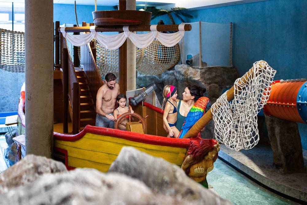 Le monde aquatique tant apprécié est merveilleusement spacieux. L’espace piscine intérieur et extérieur est vaste. Il y a en plus une grande zone de baignade pour enfants avec de nombreux toboggans, une piscine pour enfants, un bateau pirate et une rivière paresseuse. Même les petits mutins oublient de faire des vagues sur le toboggan aquatique de 90 m de long.