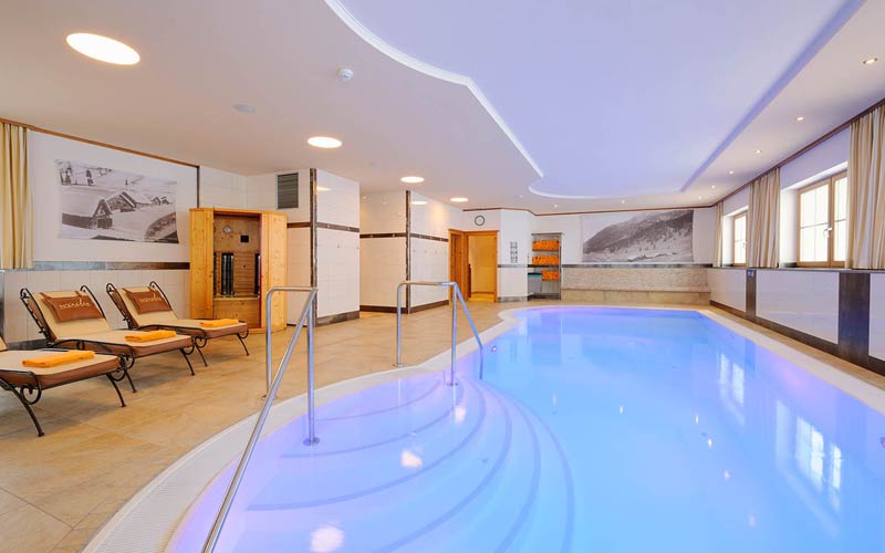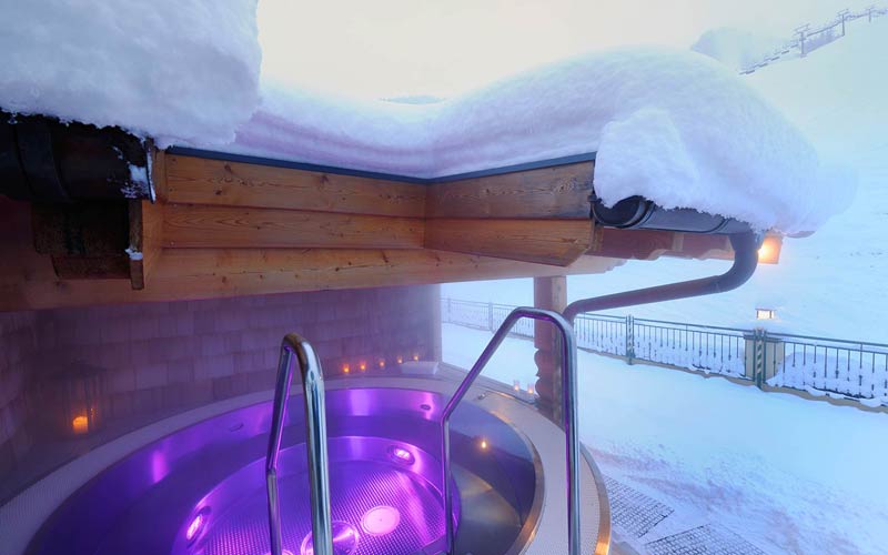 Depuis le sauna Mühlen et le jacuzzi extérieur, admirez directement la vue sur les montagnes. Notre espace bien-être de 1000 m² offre beaucoup d’espace pour se détendre et se ressourcer après une journée active en montagne.