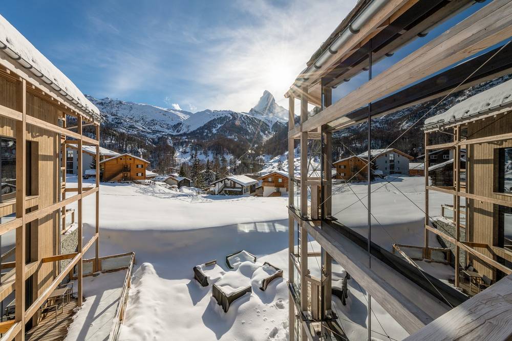 Les chambres – une expérience : 30 chambres doubles et familiales design ainsi que des suites avec de grandes baies vitrées panoramiques offrent une vue sur les montagnes valaisannes, la plupart avec vue sur le Cervin ou sur le village.